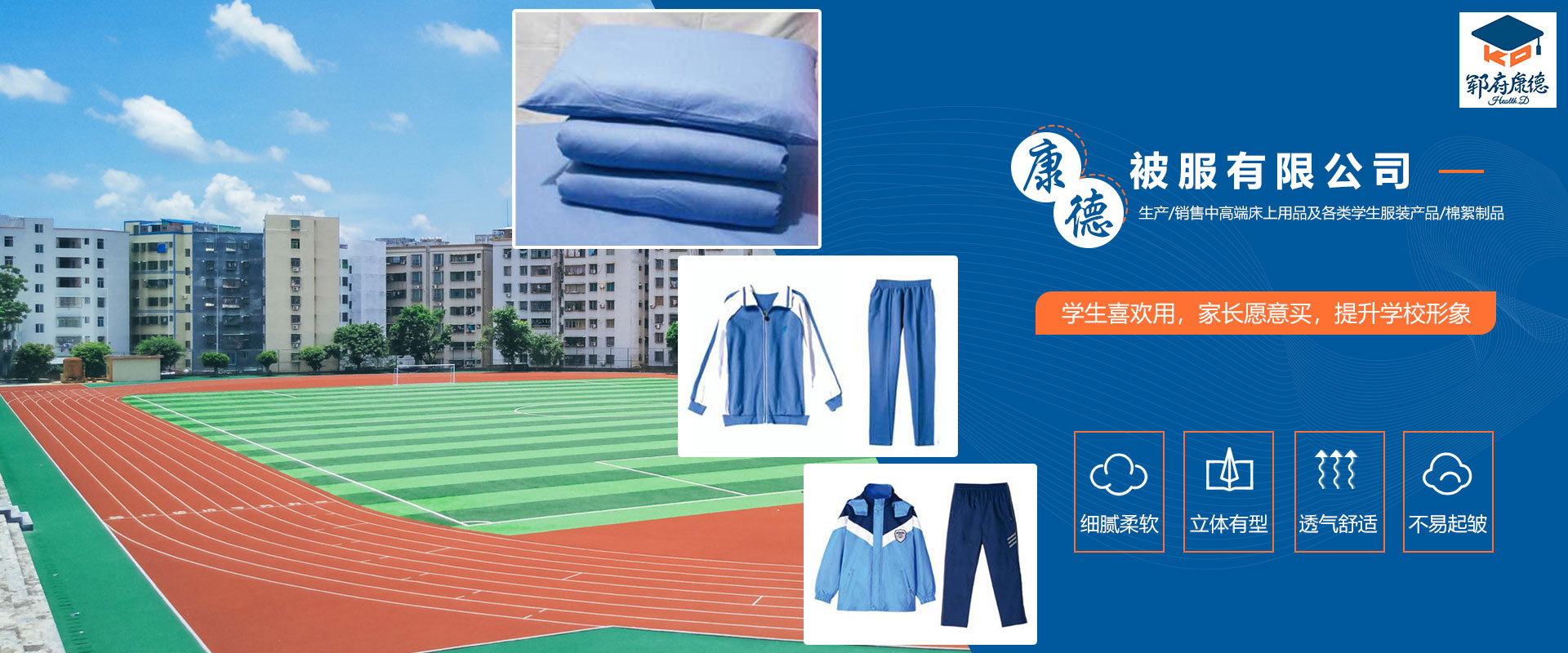 鄆城縣康德被服有限公司能根據各學校需求,為其提供棉被、床墊等學校床上用品,及校服定制、軍訓服定制等業務!